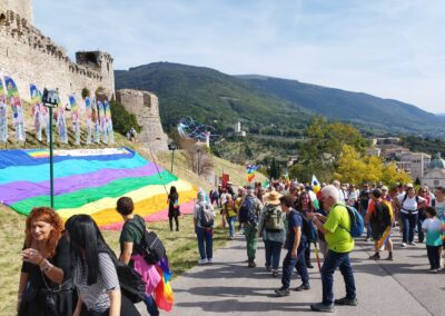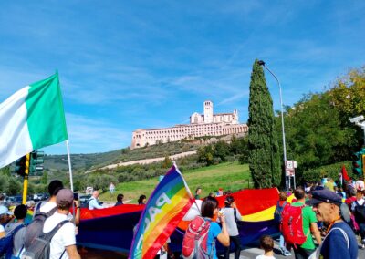 Sabato 11, partitə presto in direzione Perugia, abbiamo percorso anche un bel tratto di ciclabile sulle rive del Lago Trasimeno. Arrivatə a Perugia nel pomeriggio, ci siamo unitə alle altre cordate Fiab che sono arrivate in bici da tutta Italia e abbiamo potuto ascoltare gli interventi conclusivi della tre giorni dell’ Assemblea Onu dei popoli per la Pace, nel bel centro storico di Perugia. Domenica mattina, per le vie di Perugia, ci siamo subito trovatə immersə in una immensa folla eterogenea, in un bel clima di condivisione e fratellanza. Abbiamo faticato per farci largo tra la gente per raggiungere il punto assegnato in testa al corteo a noi ciclistə (più di 300). Dopo poco tempo dalla partenza in bici siamo dovutə scendere a piedi per accompagnare la folla che sopraggiungeva a piedi da ogni parte a tutti gli incroci, in un flusso ininterrotto di persone gioiose, in un puzzle di bandiere variopinte. Al nostro passaggio molti residenti si assiepavano ai lati della strada o sui balconi accogliendoci con applausi calorosi e offrendoci dolcetti fatti in casa, da bere ecc.. Nel corteo si sentivano molti cori sul tema della Pace, accompagnati da musica ed il vociare gioioso di numerose classi di bambini di tutte le età accompagnati da i loro insegnanti e genitori. Anche molte università erano presenti con classi di studenti, docenti e ricercatori. Praticamente trainati da questo fiume umano quasi irreale, variopinto di bandiere coloratissime, siamo giunti alla meta, la spianata della Rocca di Assisi. Il fatto di condividere in un modo così caloroso il tema della Pace con centinaia di migliaia di persone, arrivate da tutta Italia, di tutti i ceti e di tutte le età ci ha dato un po’ di speranza che la realizzazione di un mondo senza guerre sia ancora possibile.