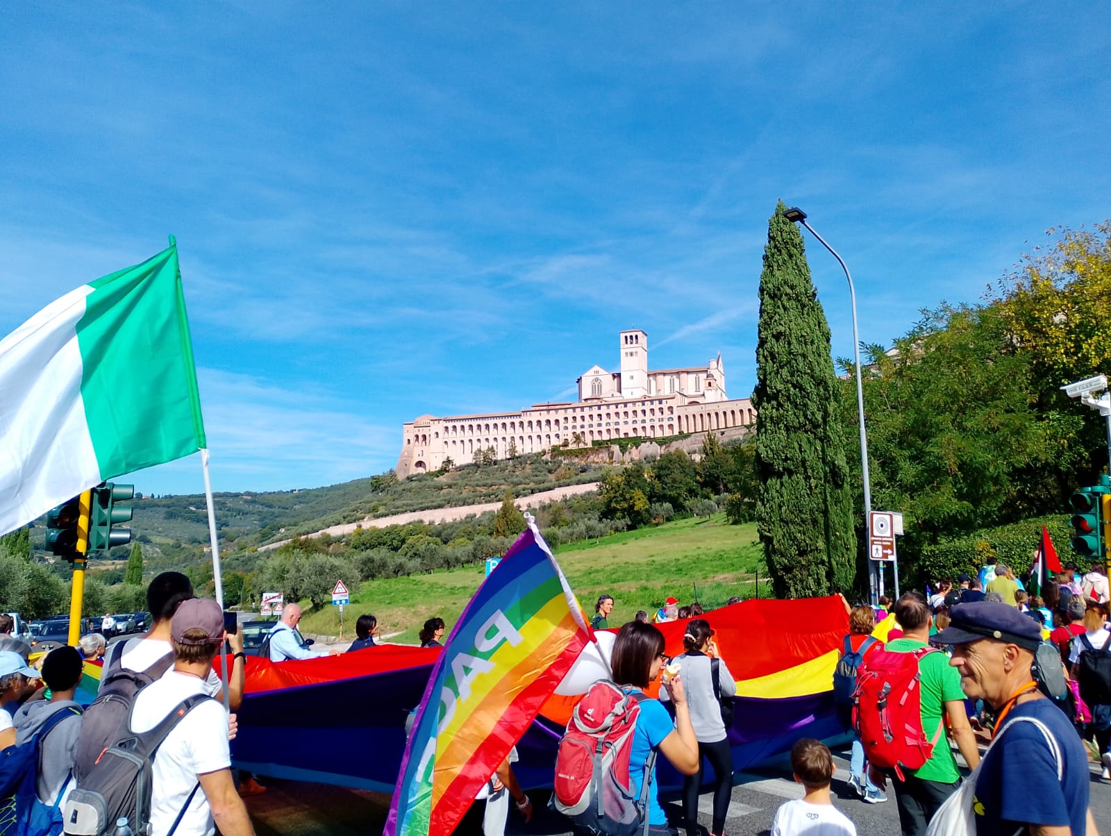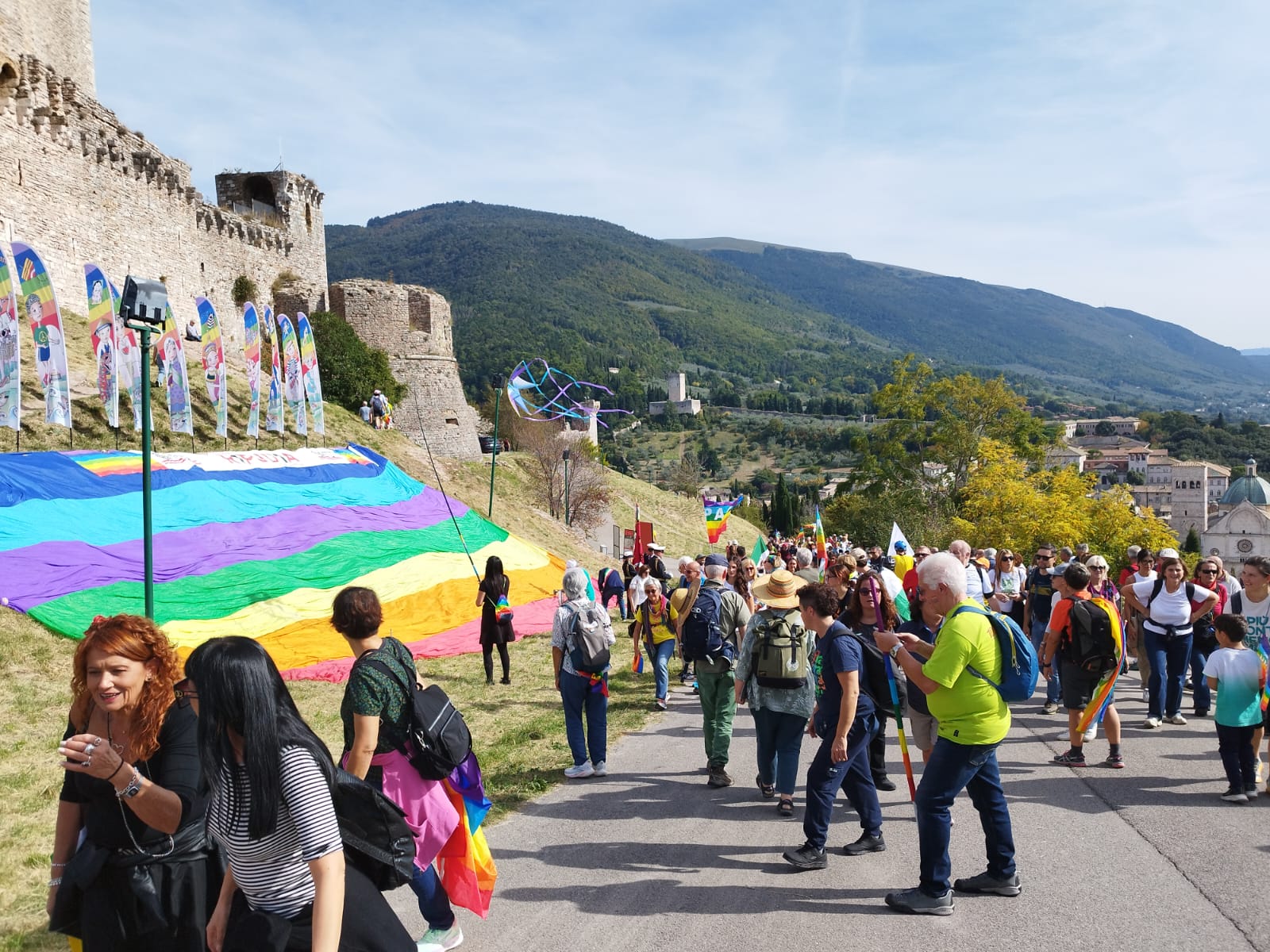 Sabato 11, partitə presto in direzione Perugia, abbiamo percorso anche un bel tratto di ciclabile sulle rive del Lago Trasimeno. Arrivatə a Perugia nel pomeriggio, ci siamo unitə alle altre cordate Fiab che sono arrivate in bici da tutta Italia e abbiamo potuto ascoltare gli interventi conclusivi della tre giorni dell’ Assemblea Onu dei popoli per la Pace, nel bel centro storico di Perugia. Domenica mattina, per le vie di Perugia, ci siamo subito trovatə immersə in una immensa folla eterogenea, in un bel clima di condivisione e fratellanza. Abbiamo faticato per farci largo tra la gente per raggiungere il punto assegnato in testa al corteo a noi ciclistə (più di 300). Dopo poco tempo dalla partenza in bici siamo dovutə scendere a piedi per accompagnare la folla che sopraggiungeva a piedi da ogni parte a tutti gli incroci, in un flusso ininterrotto di persone gioiose, in un puzzle di bandiere variopinte. Al nostro passaggio molti residenti si assiepavano ai lati della strada o sui balconi accogliendoci con applausi calorosi e offrendoci dolcetti fatti in casa, da bere ecc.. Nel corteo si sentivano molti cori sul tema della Pace, accompagnati da musica ed il vociare gioioso di numerose classi di bambini di tutte le età accompagnati da i loro insegnanti e genitori. Anche molte università erano presenti con classi di studenti, docenti e ricercatori. Praticamente trainati da questo fiume umano quasi irreale, variopinto di bandiere coloratissime, siamo giunti alla meta, la spianata della Rocca di Assisi. Il fatto di condividere in un modo così caloroso il tema della Pace con centinaia di migliaia di persone, arrivate da tutta Italia, di tutti i ceti e di tutte le età ci ha dato un po’ di speranza che la realizzazione di un mondo senza guerre sia ancora possibile.