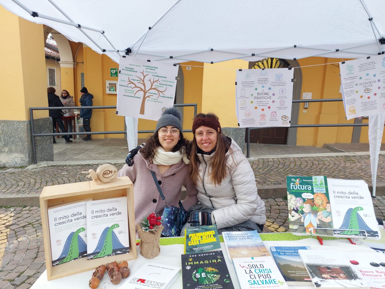 Nel periodo pre-natalizio, le piazze italiane si animano di manifestazioni, sagre e mercatini. In questo contesto, proporre un banchetto informativo del Movimento per la Decrescita Felice tra le specialità tradizionali, oggetti artigianali e associazioni locali è una scommessa interessante. La proposta della decrescita come alternativa al consumo sfrenato delle festività suscita curiosità, domande e interesse anche a livello locale, persino in sagre di paese.