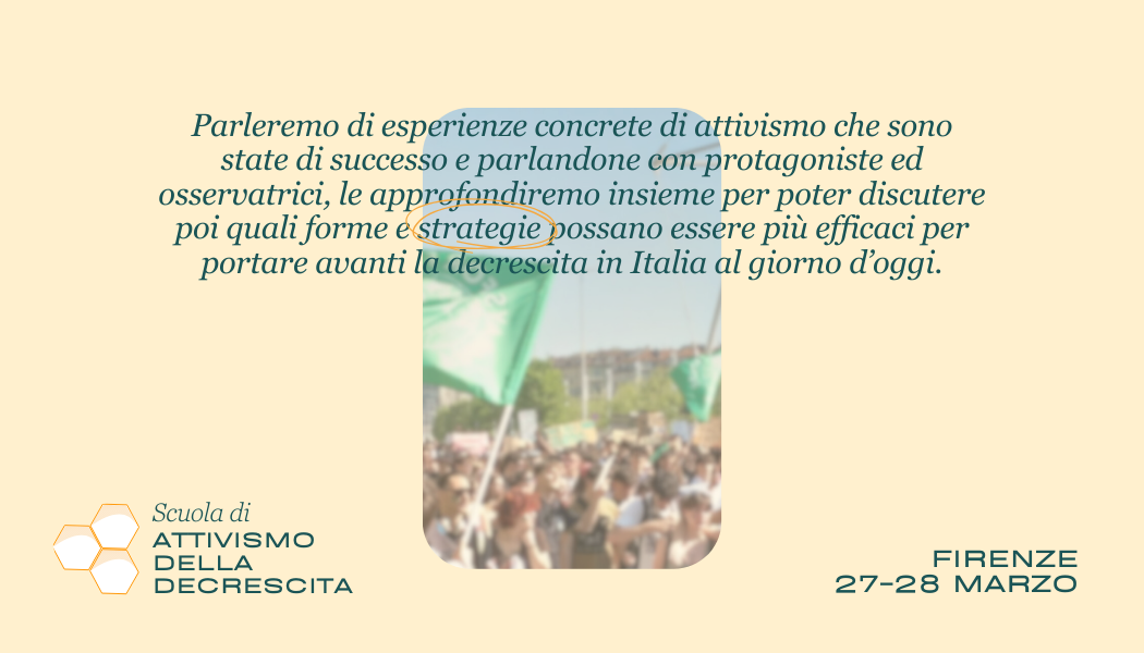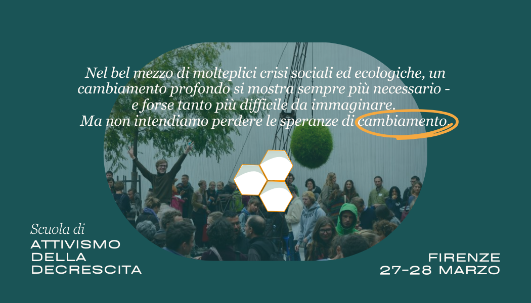 Vi invitiamo a partecipare alla prima edizione della scuola di attivismo della decrescita che si svolgerà dal 27 al 28 marzo a Casa Caciolle a Firenze.